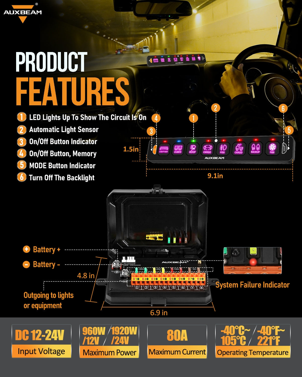Upgrade your vehicle’s control system with the AS-800 8-Gang RGB Switch Panel, designed for ultimate convenience, customization, and style. Each switch features three modes — constant, momentary, and pulsed — with fully adjustable RGB backlighting to match your dash or vehicle interior. Control your lights and accessories via the switch panel, Bluetooth app, or included wireless remote, with group settings to operate multiple devices simultaneously. Built for durability, it offers waterproof IP65 protection, automatic backlight dimming, and universal fitment for trucks, ATVs, UTVs, boats, SUVs, and more. The package includes all necessary hardware, wiring harnesses, and extension cables for easy plug-and-play installation.